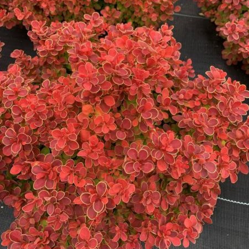 Листья большие, округлые. Листья яркие, оранжево-красные, позже появляется золотистое окаймление.