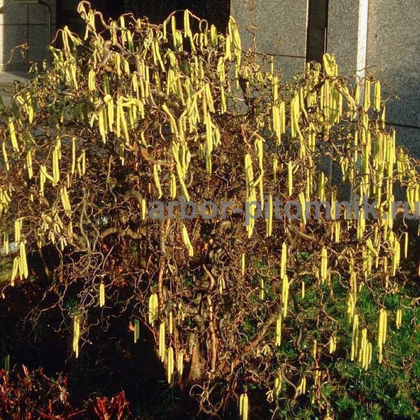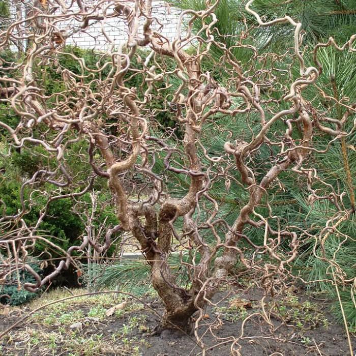 Густой кустарник или многоствольное деревце высотой 300 см. Ветви причудливо изогнуты «в штопор», листья скрученные и свёрнутые. Соцветия-серёжки жёлтые длинные очень декоративные, цветёт в апреле до распускания листьев. Плоды – «лесные орехи». Растёт на любой почве, на солнце и в полутени, лучше смотрится в одиночной посадке на видном месте