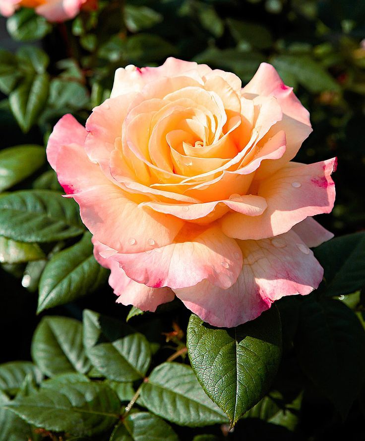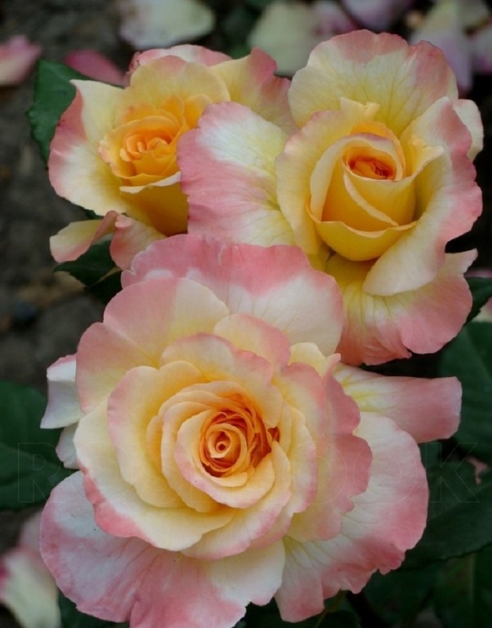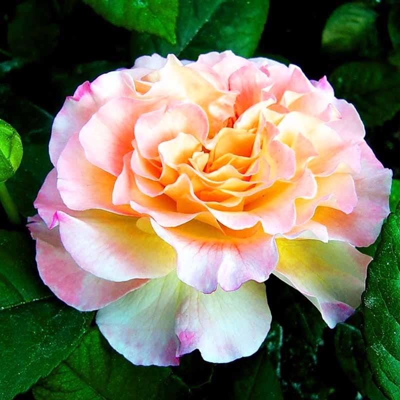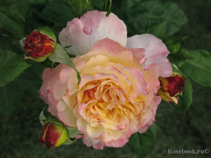 Цветок кремовый с золотисто-персиковым центром и розово-малиновыми краями лепестков, шаровидный до чашевидного, с высоким центром, густомахровый (60-70 лепестков), обладает очень насыщенным сладким фруктовым ароматом.
