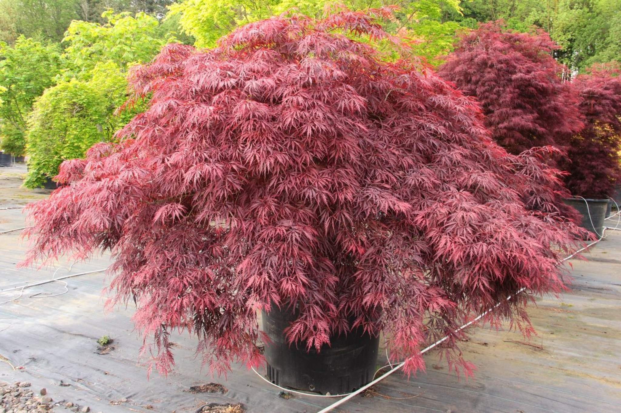 Высота 1-1,5 м. Крона шириной 1,5-2,5 м. Листья глубоко рассечённые, обычно 7-лопастные, тёмно-красные, осенью пурпурно-коричневые.