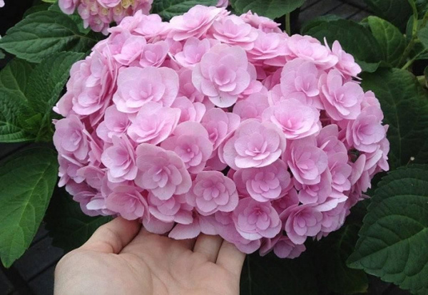Цветки махровые розовые, розетковидные. При посадке в кислую почву изменяют цвет до светло-голубого. Цветёт на прошлогодних побегах и на побегах текущего года в июле-сентябре. Подходит как для открытого грунта, так и для контейнеров. Место солнечное или полутенистое. На зиму требует укрытия или заноса контейнеров в неотапливаемое помещение с целью сохранения цветковых почек.