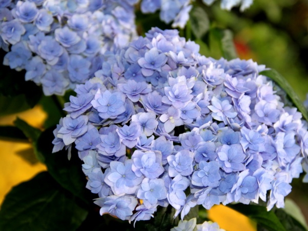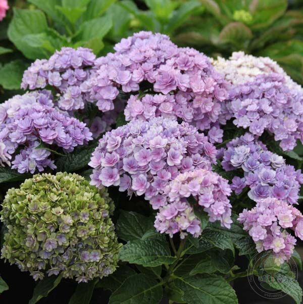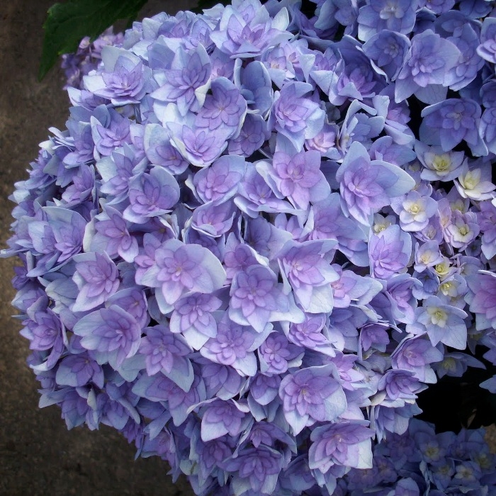 Цветёт на побегах прошлого и текущего года в июле-сентябре. Цветки махровые, в начале цветения светло-зелёные, затем розовые или голубые (в зависимости от кислотности почвы), к концу цветения фиолетовые или красные, очень равномерно расположены в плотных соцветиях диаметром 20 см.