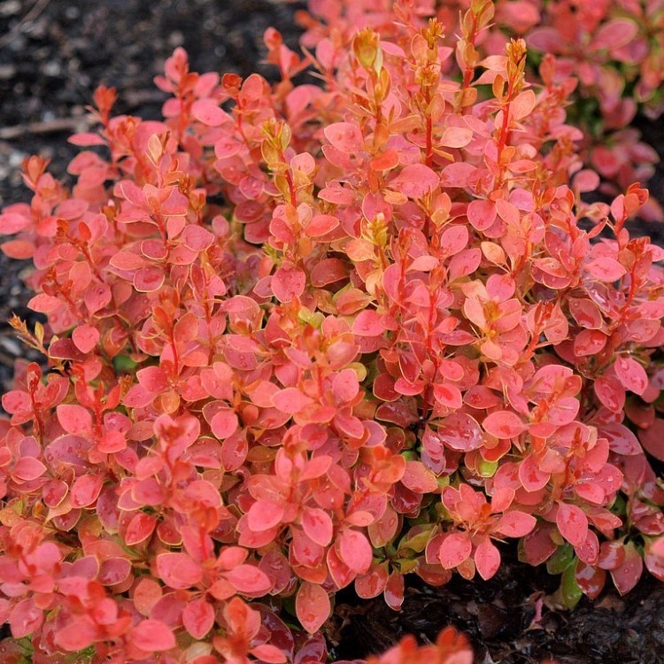 Молодые побеги красные, более светлые, чем прошлогодние побеги, что в весеннее время придаёт растению дополнительной красочности. Листья мелкие блестящие пурпурного цвета с красивой золотистой каймой. Глубокий красный цвет сохраняется до поздней осени.