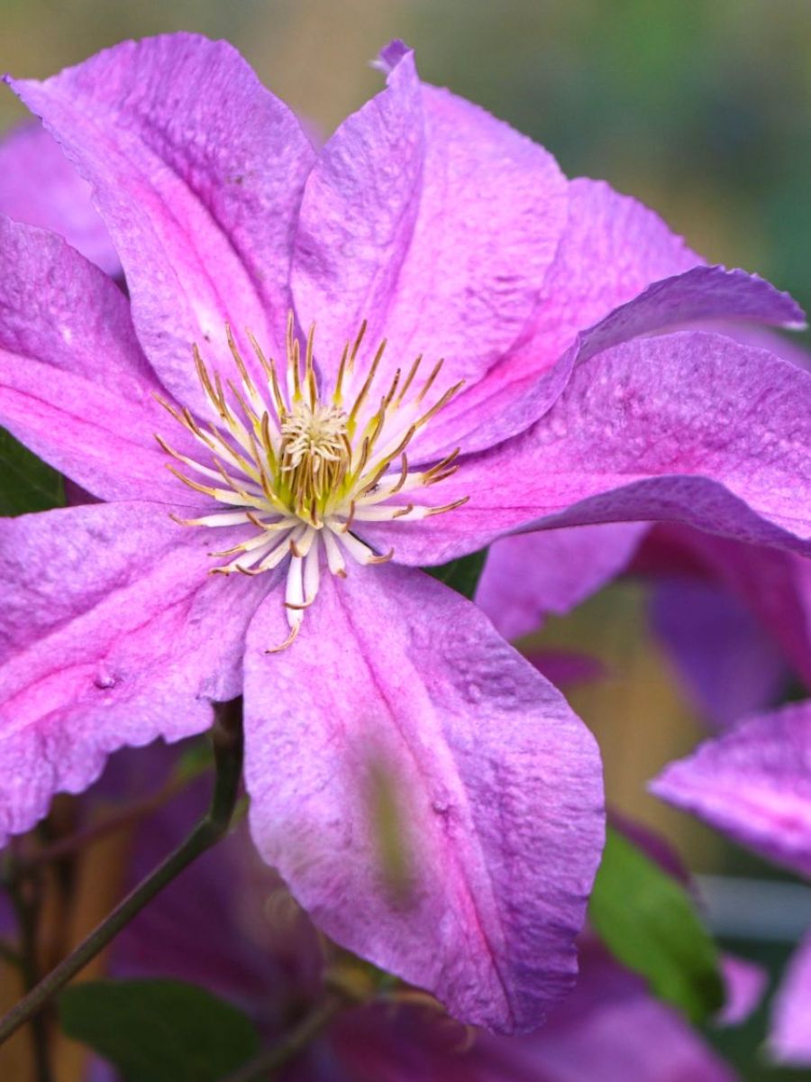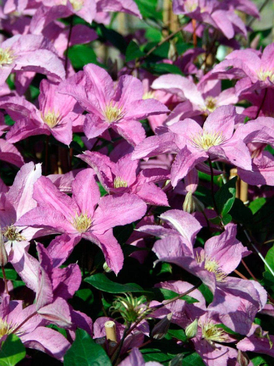 Крупные цветки окрашены в яркий розовый цвет. При этом на фоне лепестков эффектно выделяются тычинки кремово-зеленого цвета. Диаметр цветков от 15 до 20 см, лепестки волнистые, выглядят изысканно декоративно. Форма чашелистиков может быть ланцетовидной или овальной. Может карабкаться по натуральным опорам, напр. лиственным или хвойным деревьям или кустарниками.
