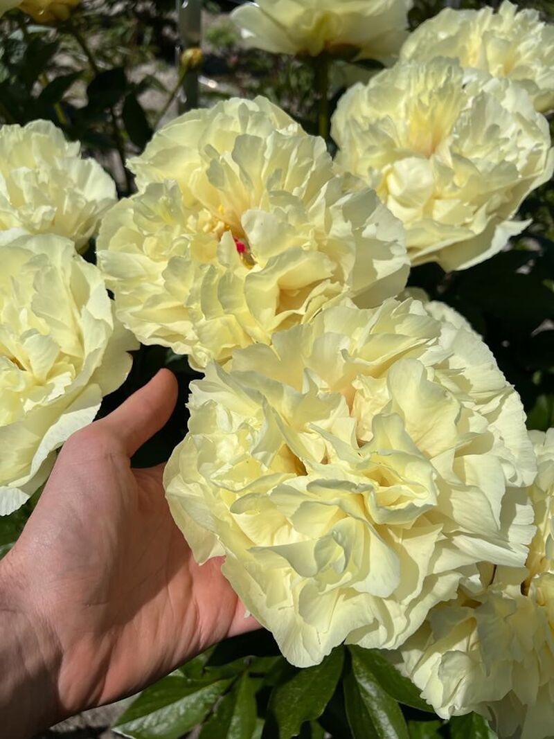 Цветы махровой или полумахровой формы. Бледно-жёлтого цвета слегка переходящий в тёплые сливочные тона. Рыльца розовые, но при полной махровой форме, они практически не видны.