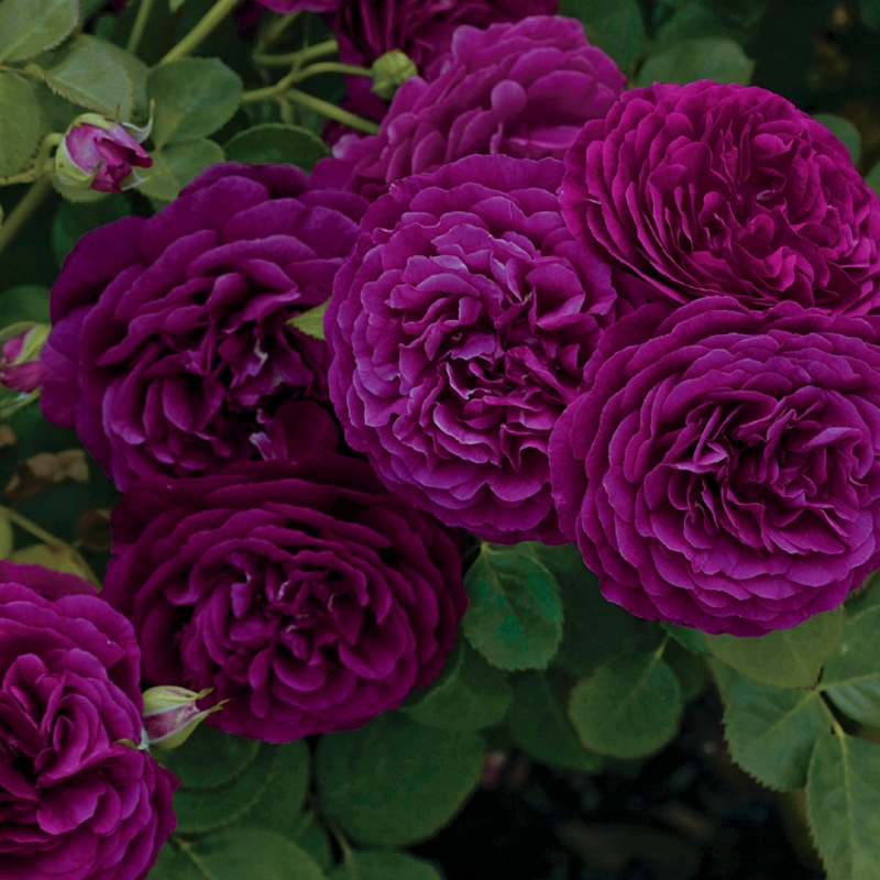 Цветки глубокого, бархатистого пурпурного оттенка, старомодной формы, густо-махровые, с интенсивным ароматом гвоздики и лимона.