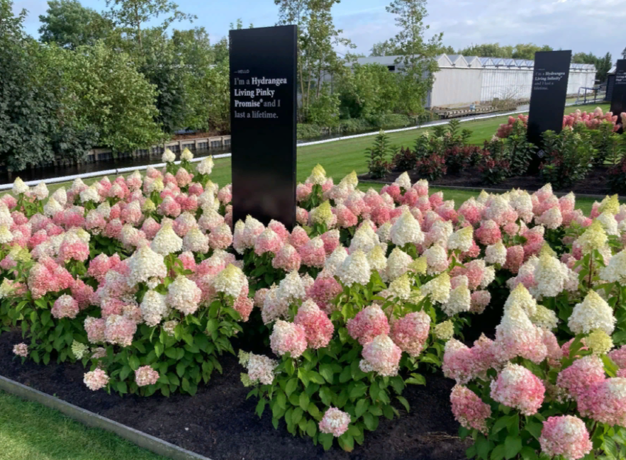 Конусовидные соцветия с большим количеством стерильных цветков, чисто-белые, затем приобретают пурпурно-розовый оттенок. Цветет с июля до сентября.
